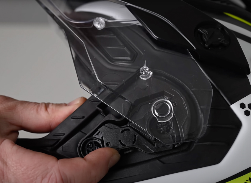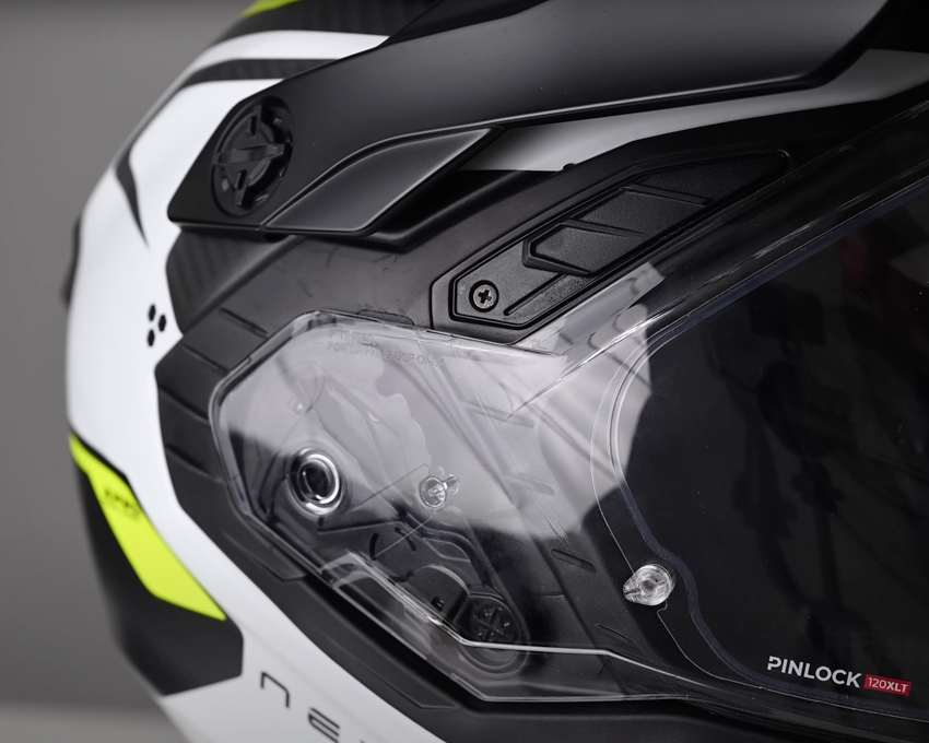 I’ve been wearing Keyo design in fluro and white which is one of the full carbon fibre shell versions. There are also composite shells available in the range at a lower price point. Regardless of their construction have three shell sizes which cover the entire size range. The X.Wed3, fully kitted out with the peak and visor, ready to ride, weighed in on my scales at 1,780gm. So it’s not a particularly light helmet but in use, I didn’t really notice it it never gave me any problems. It has a drop-down tinted shield with a nice action and excellent coverage, the shield itself being 18% larger than the X.Wed2. The main visor has a central tab along with two smaller tabs on either side which is good to see. The carbon helmets are fitted with a Pinlock 120 XLT insert which is the same found in the new Arai Tour X5. It offers an excellent quality of vision as well as a very wide field of view.